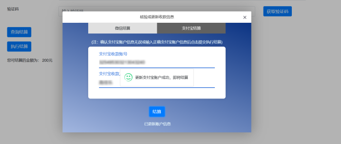4.此处以支付宝结算为例演示,可以看到提示用户校验或补全支付宝账户信息,确认支付宝账户信息无误后,点击支付宝方式结算按钮,然后在手机上看到了钱已到账。
