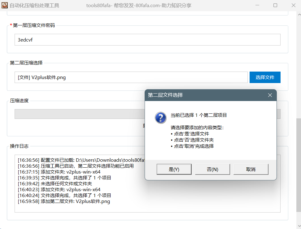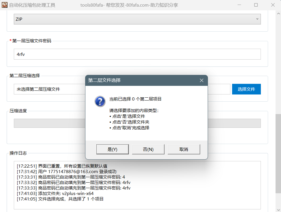 - 这里第一层压缩密码已经自动填写好了,此时可不用选择第二层压缩文件,程序会自动获取商品的二维码图片并添加到第二层压缩文件中;若是用户想添加第二层压缩的文件内容,可直接选取文件添加。