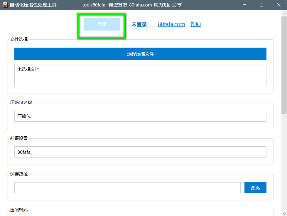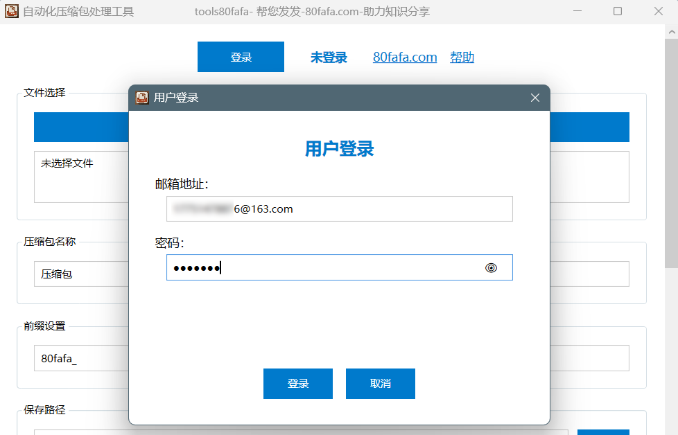 - 若用户登录压缩软件进行使用,则要先登录 https://www.80fafa.com 进行注册,因为压缩软件的登录邮箱地址与80fafa.com网站注册登录的邮箱地址是一致的。
