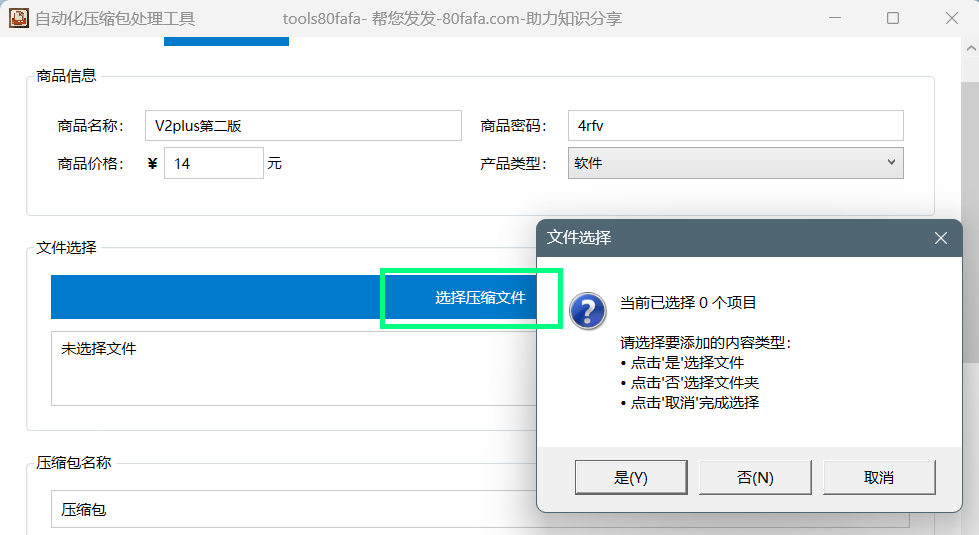 当用户登录tools80fafa压缩软件时,可以使用以下功能完成商品打包并且商品会自动同步新建到https://www.80fafa.com ,所以此时用户就不用在网站上新建商品。