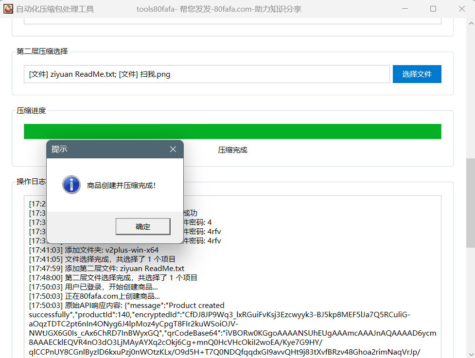 - 下载保存从 https://www.80fafa.com 新建商品的二维码图片(此二维码图片为带有解压商品的密码图片,需扫码付款才可获得密码),并在第二层压缩文件选择这个图片,然后点击“开始压缩”按钮。
