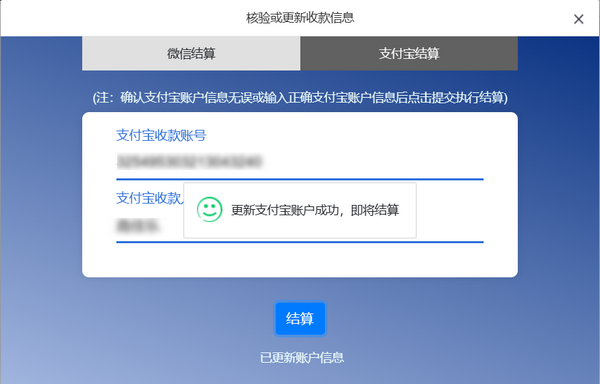 1. 此处以支付宝结算为例演示,可以看到提示用户校验或补全支付宝账户信息,确认支付宝账户信息无误后,点击支付宝方式结算按钮,然后在手机上看到了钱已到账。