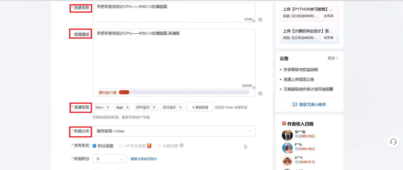 2. 在该平台填写资源名称、资源描述、资源标签、所属分类,附上资源链接,点击提交。
