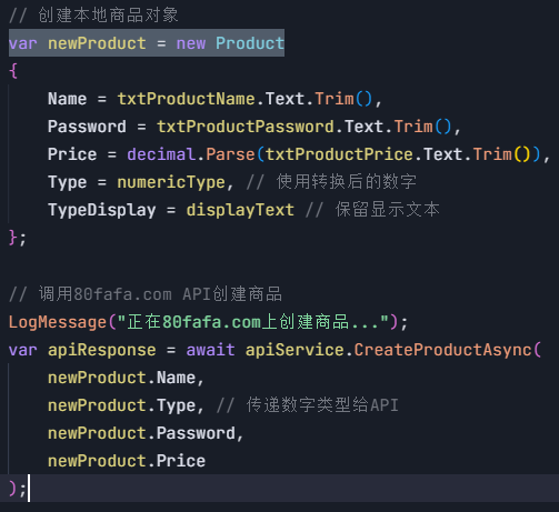 - 程序把商品信息打包并发送到 https://80fafa.com/api/ProductApi/CreateProduct ,等待服务器回复。