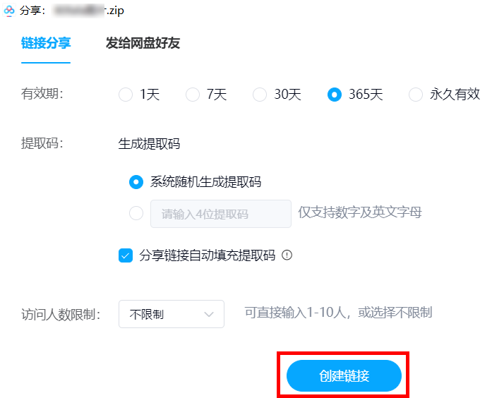 - 系统会自动生成解压密码,设置链接有效时间,点击创建链接。