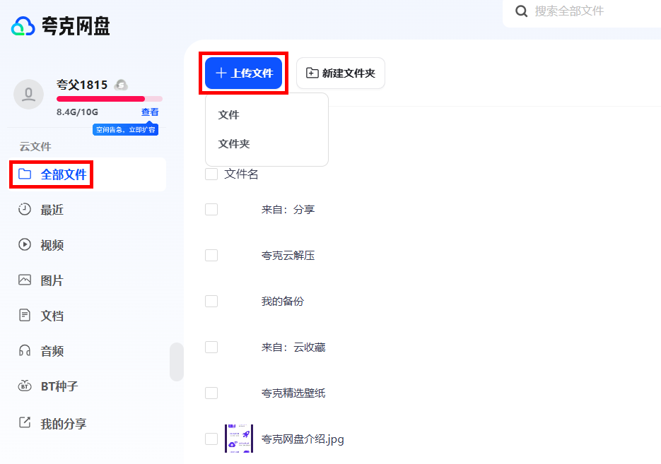 - 夸克网盘也是大家常用的网盘,操作方法与百度网盘雷同,在全部文件中找到上传文件,上传你想要上传的文件。