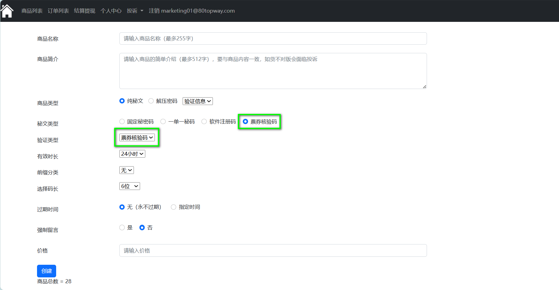 3. 指定过期时间、是否需要留言、填写商品价格,当商品已过期终端用户将无法购买此商品,发码用户选择需要强制留言,此时终端用户必须填写留言才可以购买商品,商品内容填写完成,点击“创建”按钮发布商品。