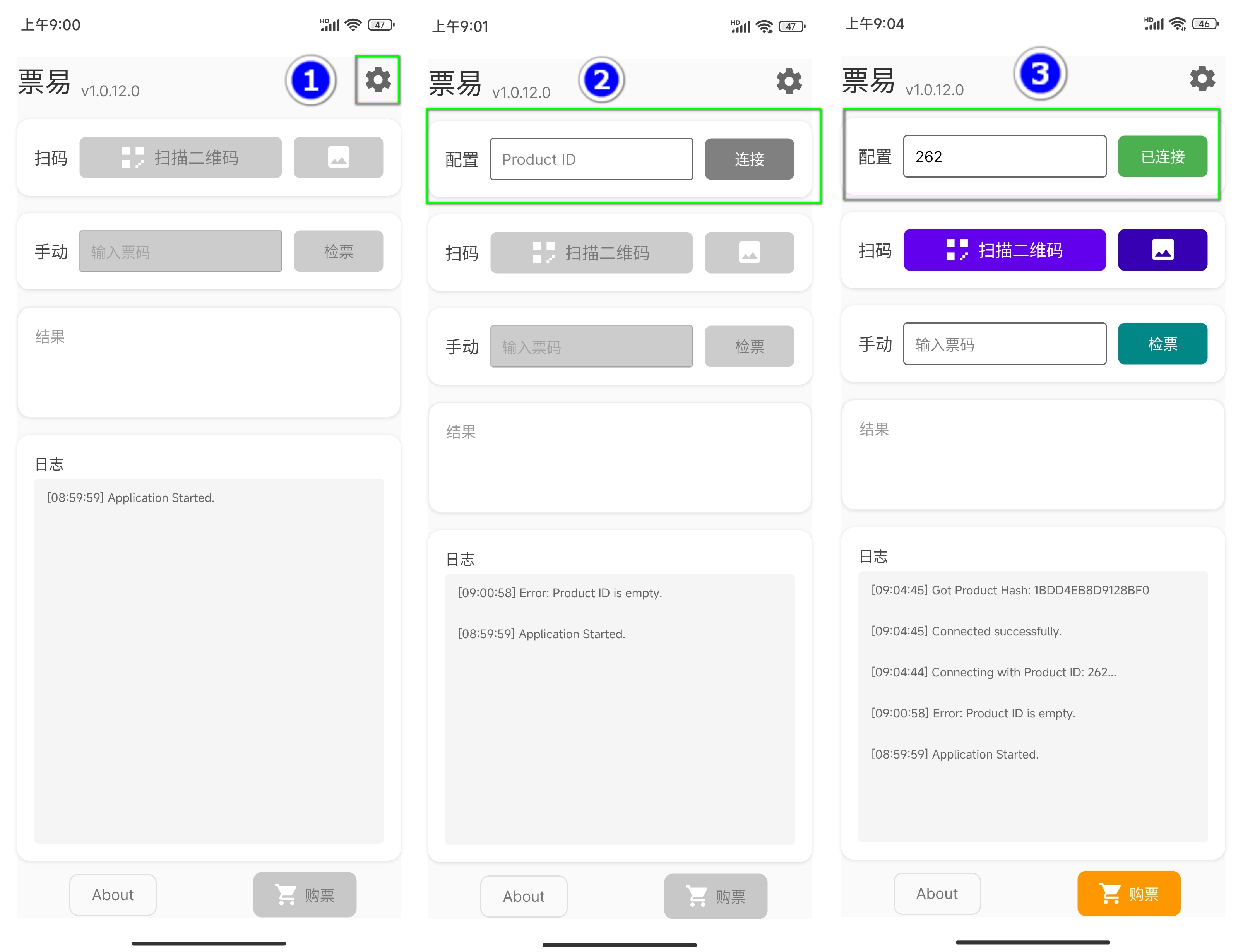 1. 下载并打开 TicketEasy 票易 App, 点击设置图标,显示配置输入框,在框内输入已创建商品 ID 并点击连接,就会激活该商品验票及购票功能,商品 ID 在 80fafa.com 商品列表页面可以看到。