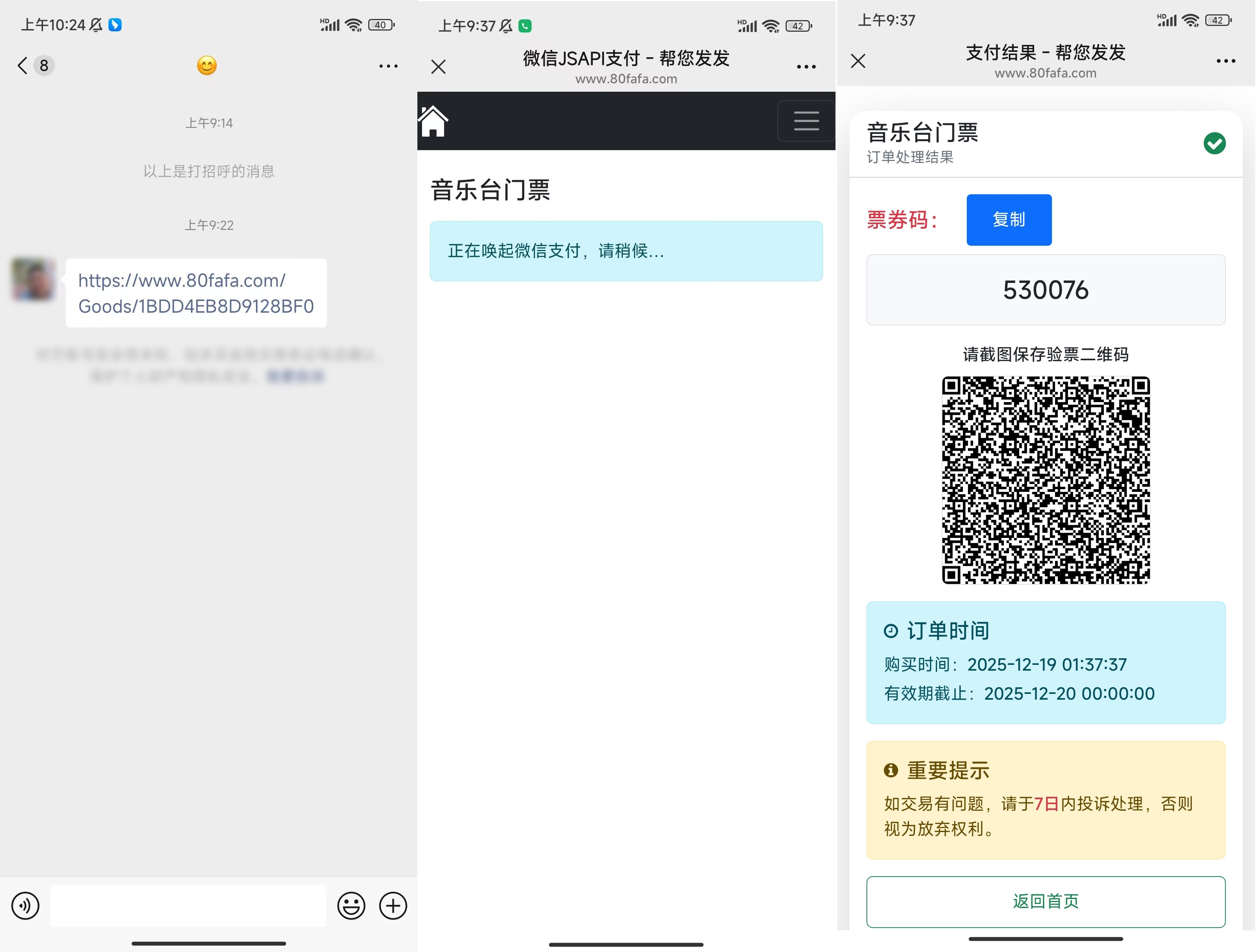 1. 买家如果没有购票,验票人可直接点击 App 购票按钮会跳转到商品购买页面,将此商品链接分享给买家,点击支付宝按钮就可直接付款,如果使用微信支付,就需要点击复制分享链接并粘贴到微信,点击该链接付款,就会获得该商品的票券码。