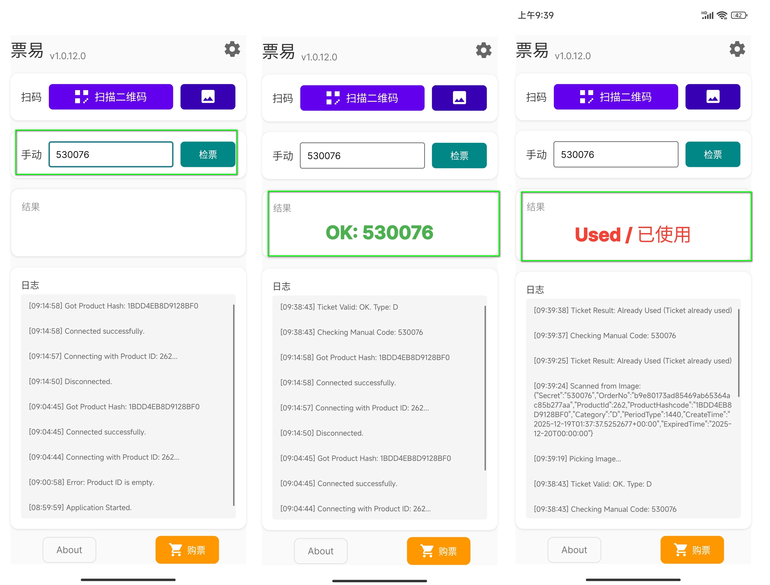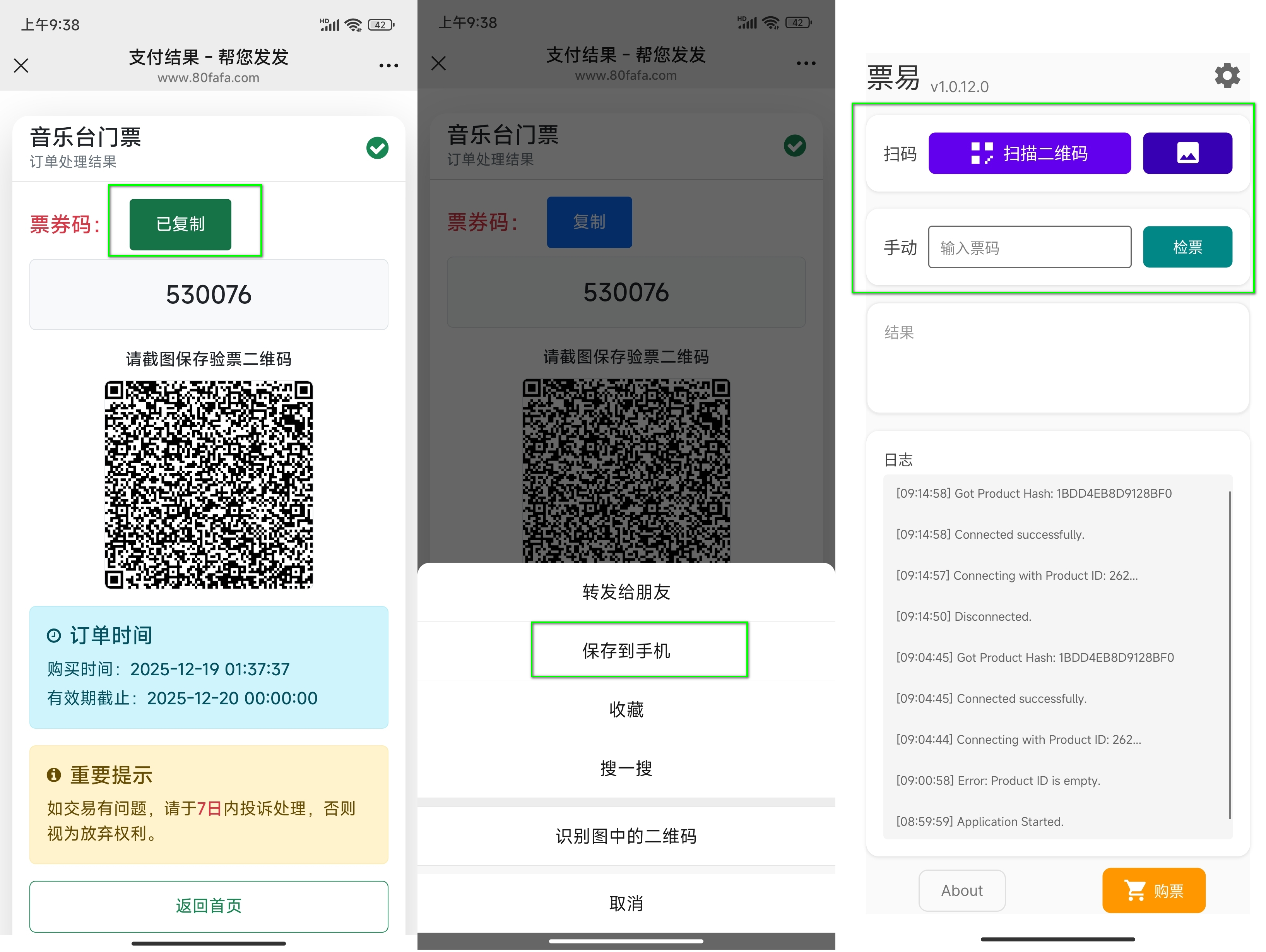 1. 在订单结果页面点击复制票券码或者保存票券码二维码图片,在 App 程序中可扫码、输入票码进行验票,已经核验票券就无法再次使用。